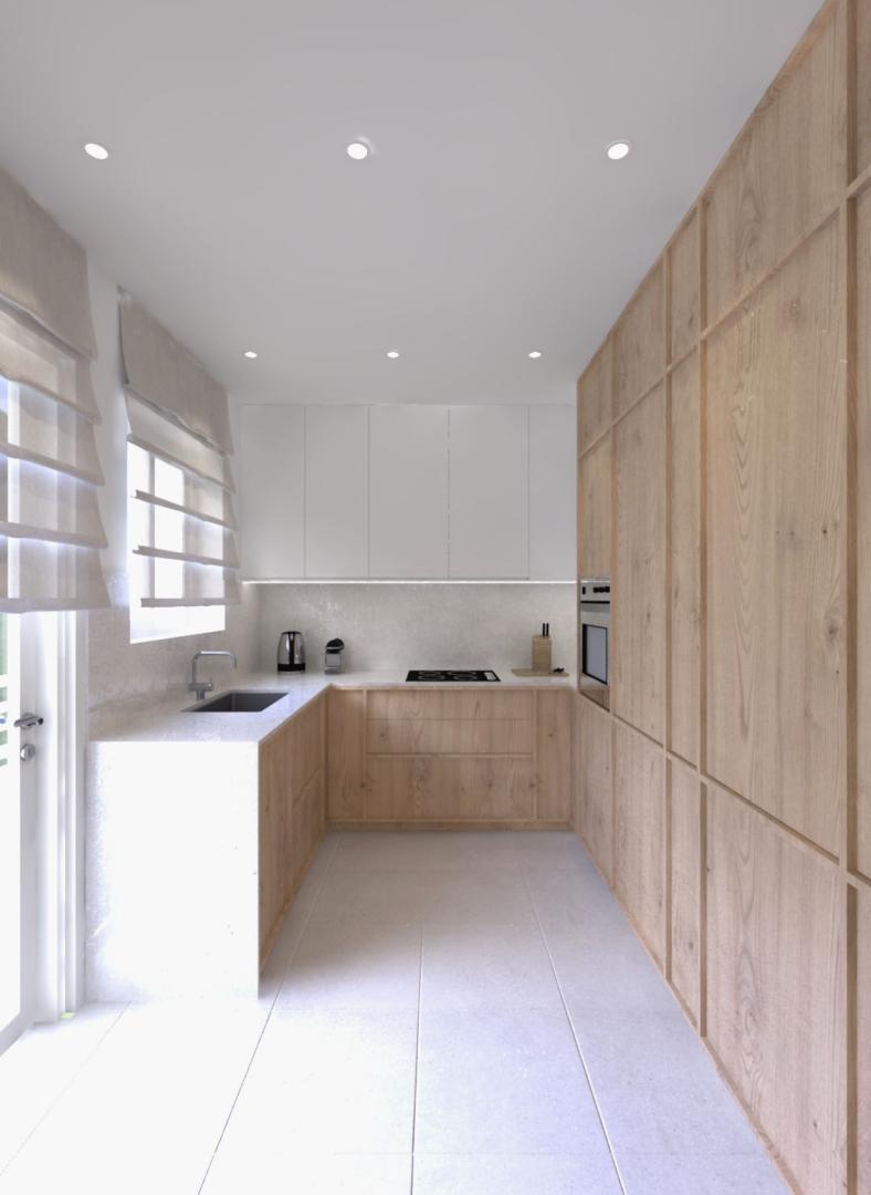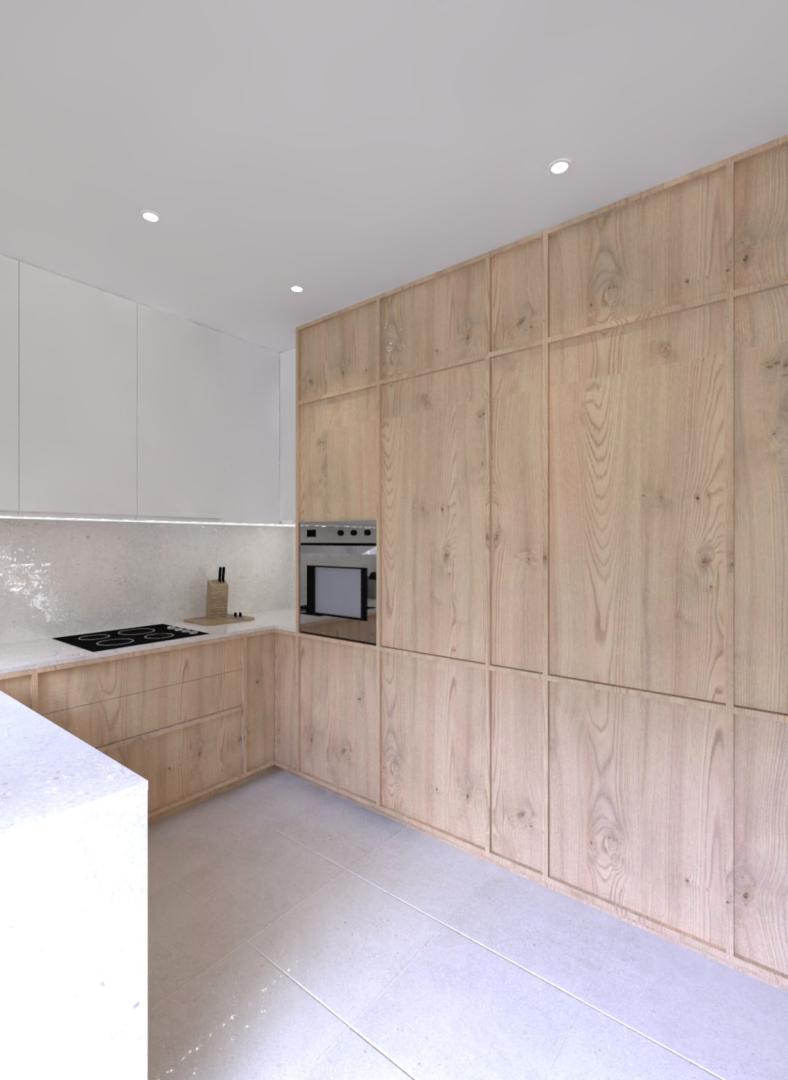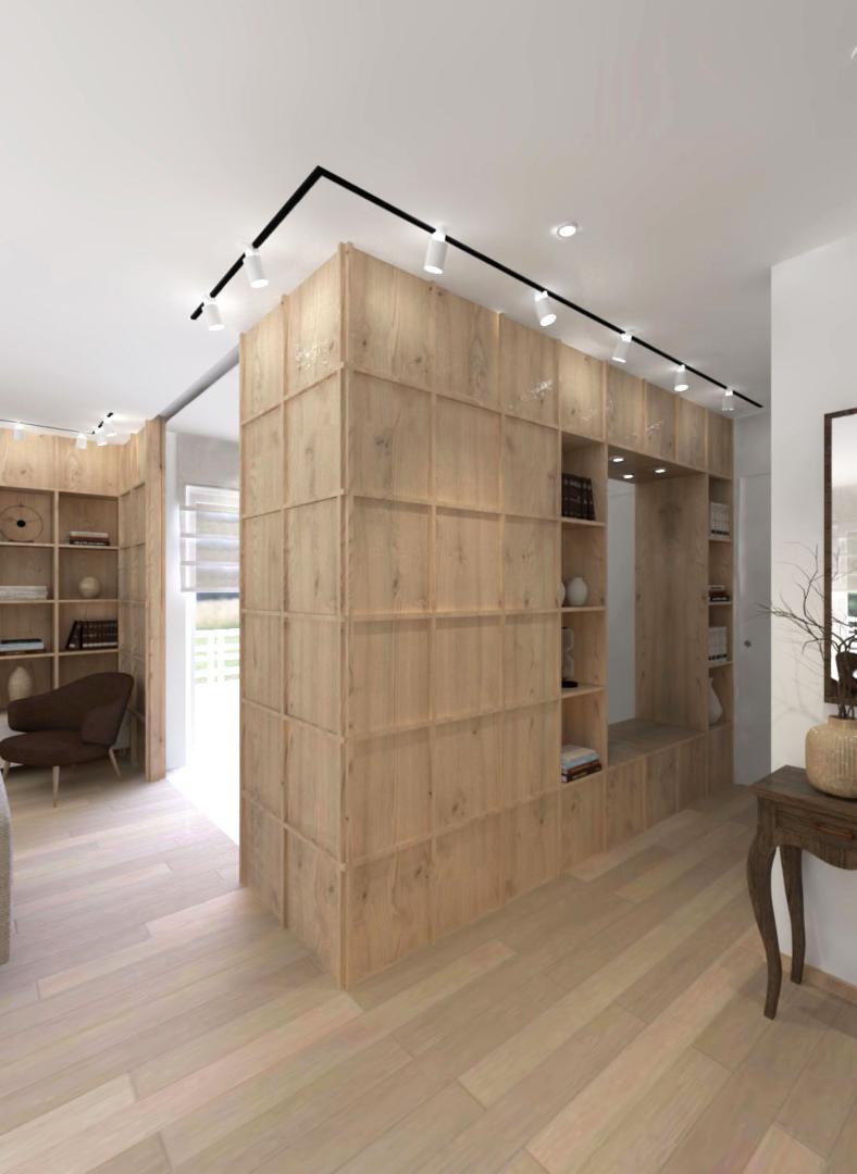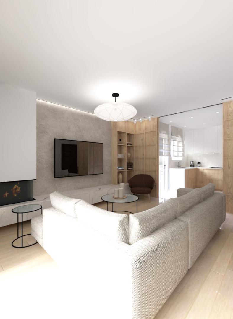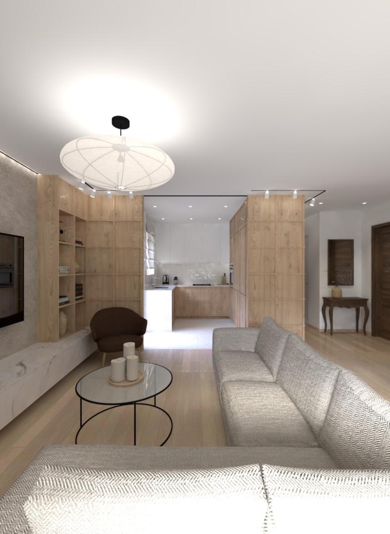 Για να αντιμετωπιστεί ο προβληματισμός σχετικά με το αν είναι προτιμότερη μία ανοιχτή ή κλειστή κουζίνα, η πρόταση περιλαμβάνει μια συρόμενη χονευτή πόρτα μεταξύ της κουζίνας και του χώρου καθιστικού–τραπεζαρίας. Η πόρτα μπορεί να κρύβεται πλήρως μέσα στον τοίχο ώστε το διαμέρισμα να λειτουργεί ως ενιαίος χώρος, ή να κλείνει όταν επιθυμείται ένας πιο σαφής διαχωρισμός μεταξύ κουζίνας και καθιστικού. Η επέμβαση ενισχύει τη χωρική σαφήνεια, τη λειτουργικότητα και την καθημερινή άνεση, διατηρώντας παράλληλα μια ήρεμη και σύγχρονη ατμόσφαιρα στο εσωτερικό.
