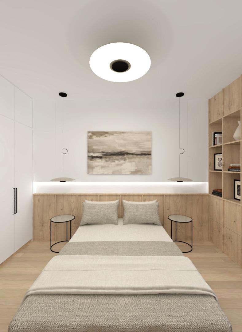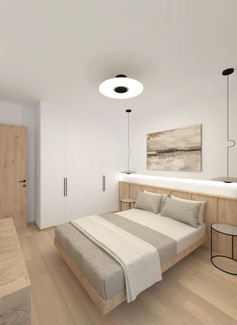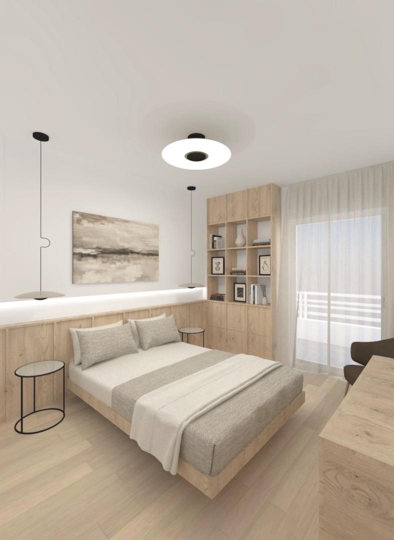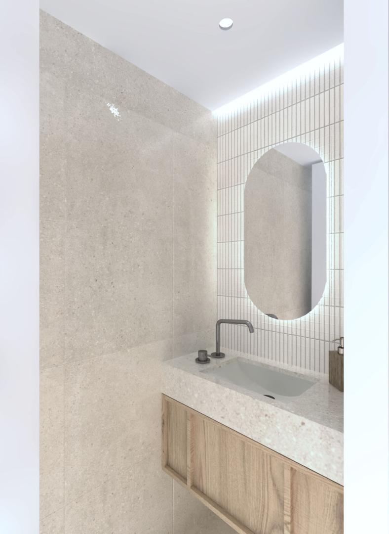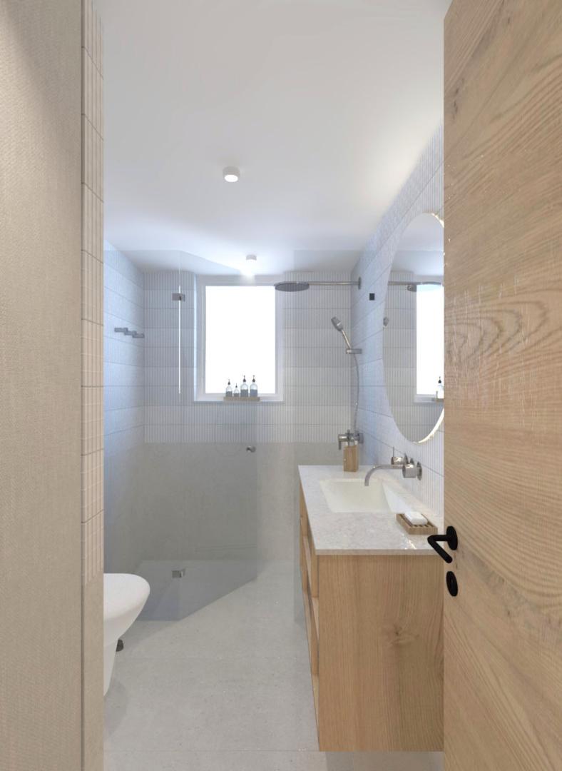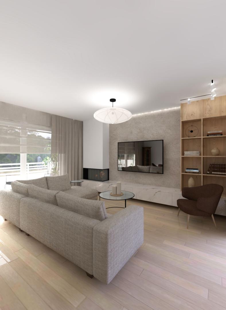 Για να αντιμετωπιστεί ο προβληματισμός σχετικά με το αν είναι προτιμότερη μία ανοιχτή ή κλειστή κουζίνα, η πρόταση περιλαμβάνει μια συρόμενη χονευτή πόρτα μεταξύ της κουζίνας και του χώρου καθιστικού–τραπεζαρίας. Η πόρτα μπορεί να κρύβεται πλήρως μέσα στον τοίχο ώστε το διαμέρισμα να λειτουργεί ως ενιαίος χώρος, ή να κλείνει όταν επιθυμείται ένας πιο σαφής διαχωρισμός μεταξύ κουζίνας και καθιστικού. Η επέμβαση ενισχύει τη χωρική σαφήνεια, τη λειτουργικότητα και την καθημερινή άνεση, διατηρώντας παράλληλα μια ήρεμη και σύγχρονη ατμόσφαιρα στο εσωτερικό.