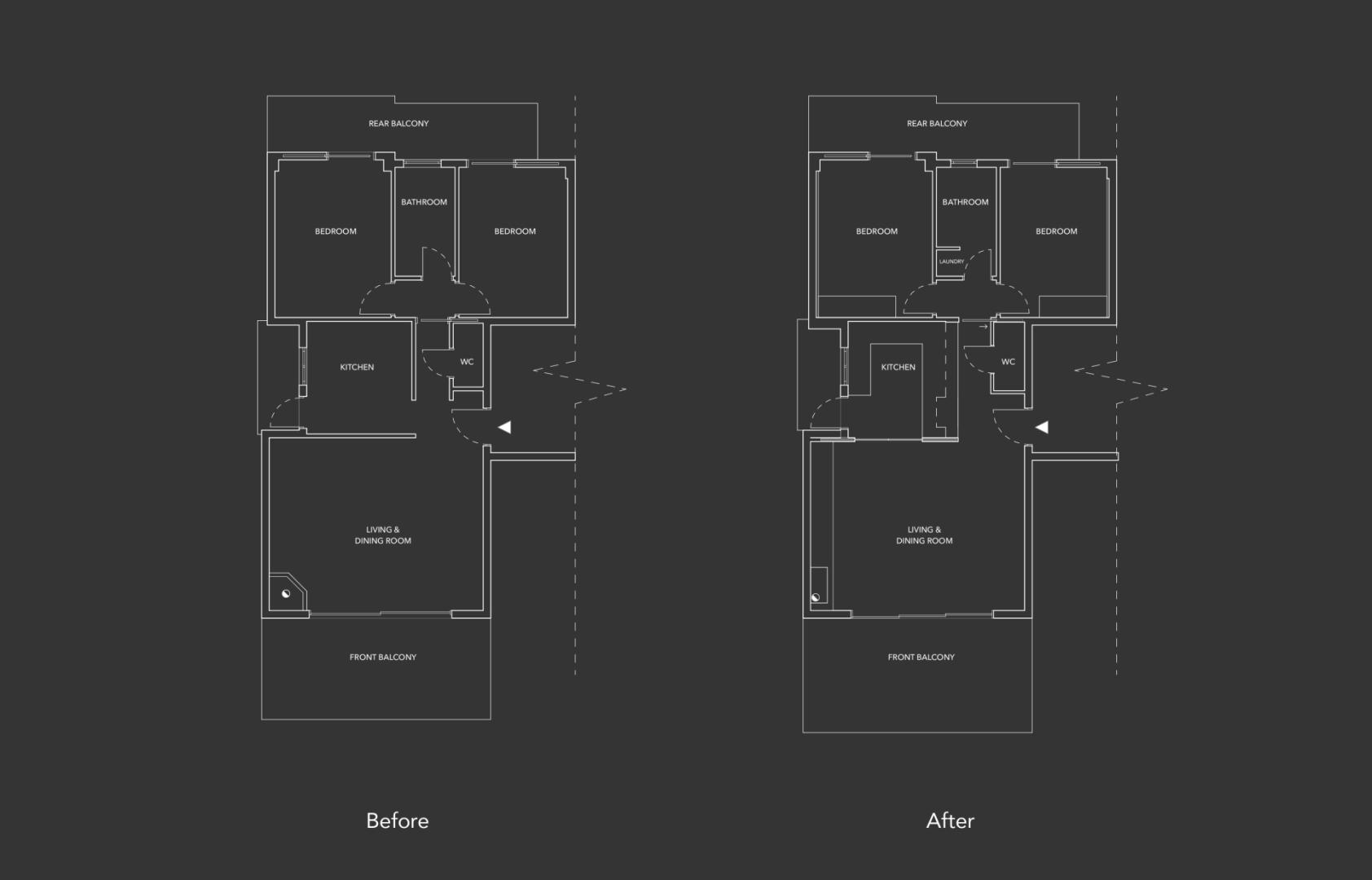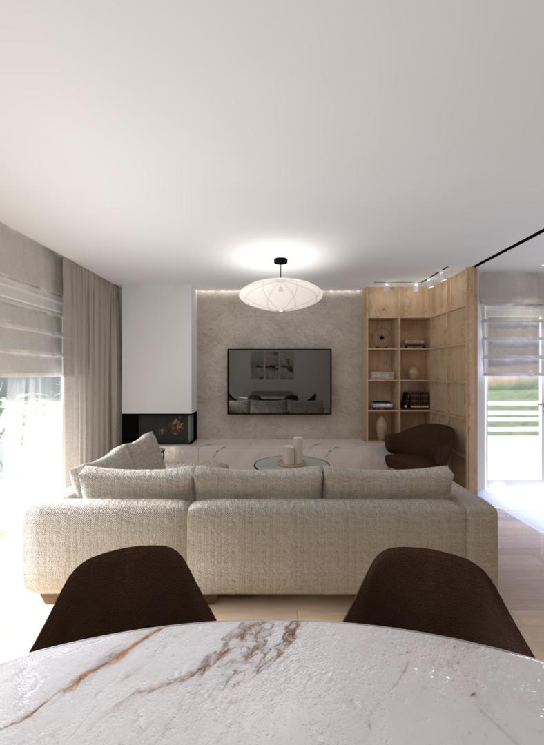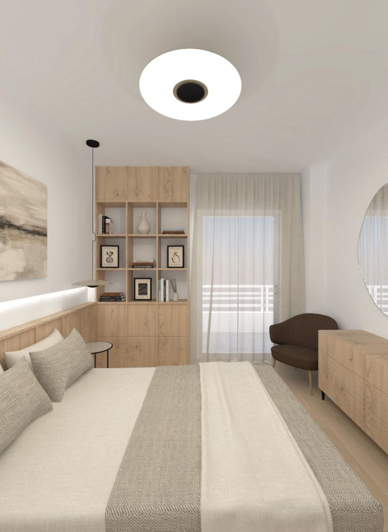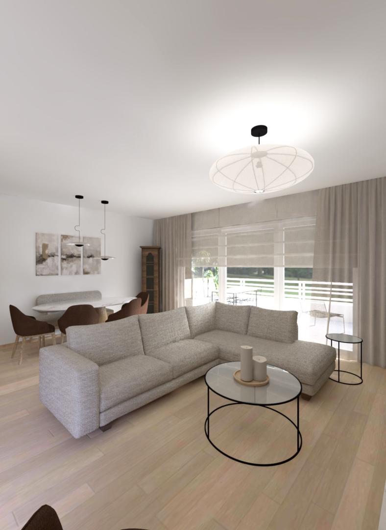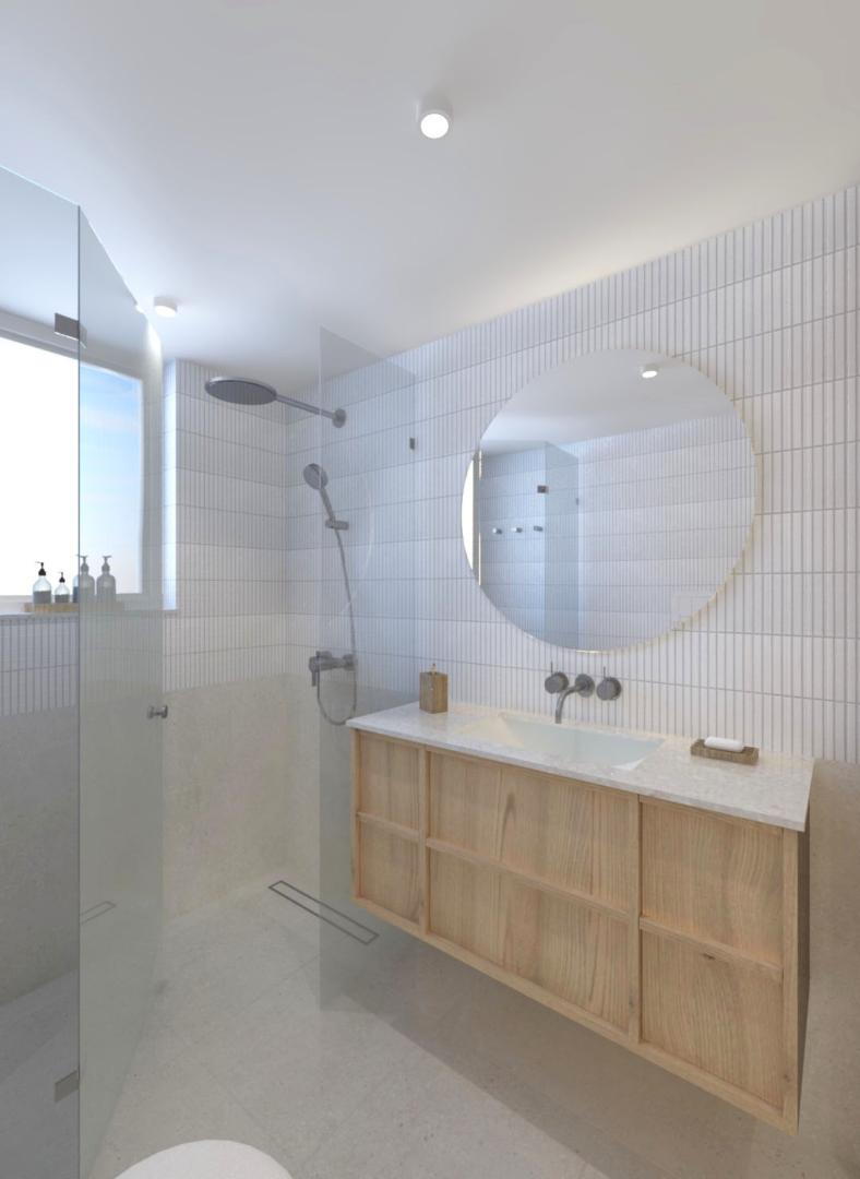 Για να αντιμετωπιστεί ο προβληματισμός σχετικά με το αν είναι προτιμότερη μία ανοιχτή ή κλειστή κουζίνα, η πρόταση περιλαμβάνει μια συρόμενη χονευτή πόρτα μεταξύ της κουζίνας και του χώρου καθιστικού–τραπεζαρίας. Η πόρτα μπορεί να κρύβεται πλήρως μέσα στον τοίχο ώστε το διαμέρισμα να λειτουργεί ως ενιαίος χώρος, ή να κλείνει όταν επιθυμείται ένας πιο σαφής διαχωρισμός μεταξύ κουζίνας και καθιστικού. Η επέμβαση ενισχύει τη χωρική σαφήνεια, τη λειτουργικότητα και την καθημερινή άνεση, διατηρώντας παράλληλα μια ήρεμη και σύγχρονη ατμόσφαιρα στο εσωτερικό.