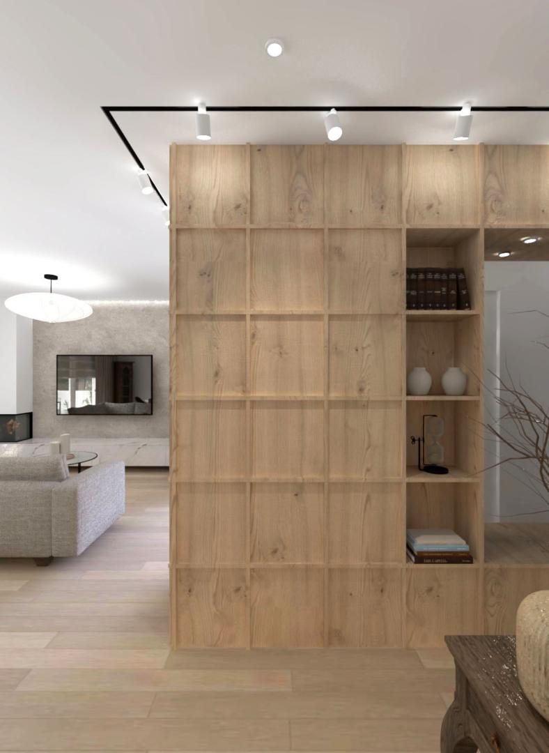 Η πρόταση εισάγει έναν ενιαίο αποθηκευτικό τοίχο που οργανώνει το κεντρικό τμήμα της κατοικίας. Από την πλευρά της κουζίνας, ο τοίχος φιλοξενεί εκτεταμένα ντουλάπια και ενσωματωμένους αποθηκευτικούς χώρους και συσκευές, ενώ από την πλευρά της εισόδου ενσωματώνει ντουλάπα εισόδου, χώρο αποθήκευσης παπουτσιών, δύο στενές βιβλιοθήκες καθώς και μια μικρή εσοχή καθίσματος με καθρέφτη. Παράλληλα, το στοιχείο αυτό διαχωρίζει διακριτικά τον χώρο της εισόδου και το WC από τους κύριους χώρους διημέρευσης.