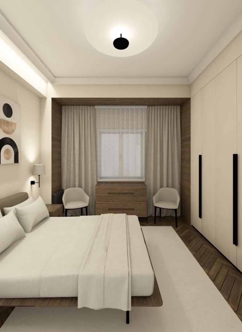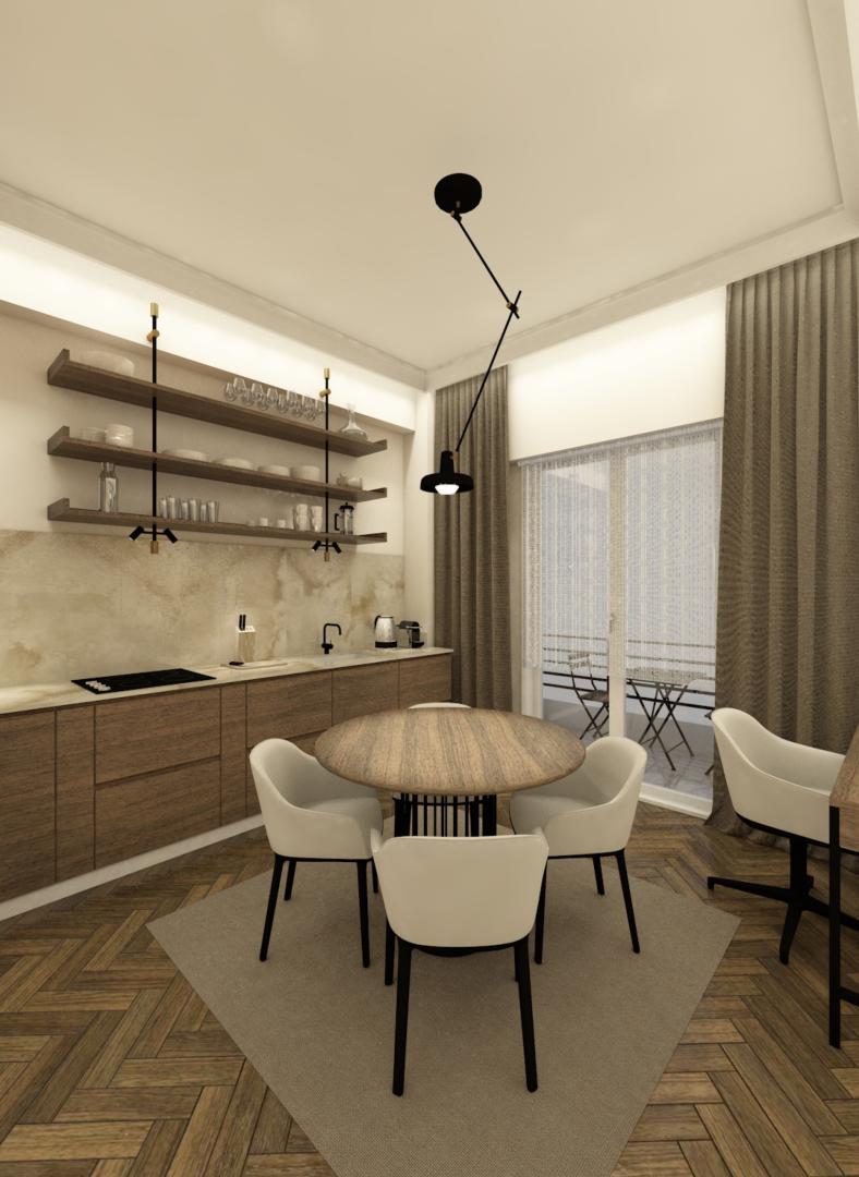 This project involves the renovation of a small residential apartment located in Exarcheia, Athens. Theoriginal layout reflected a common typology of Athenian apartment buildings from the1960s and 1970s, characterised by a large entrance hall and a separate kitchen facing the rear of the building. This arrangement resulted in a fragmented plan, with limited spatial continuity and inefficient use of the available floor area.The proposed layout rethinks this organisation in response to contemporary patterns of living. The bedroom was relocated to the quieter and darker rear part of the apartment, formerly occupied by the kitchen, allowing the main living areas to unfold towards the front. This intervention enabled the creation of an open-plan kitchen, dining, and living space, conceived as the social and functional core of home. In order to ensure that the apartment could sustain its sense of comfort and luxury in everyday use, generous storage was carefully integrated throughout the layout. A dedicated laundry and storage room was introduced within the previously underused entrance hall, transforming it into a functional buffer space that supports daily routines. Material choices emphasise restraint and tactility, with attention to texture, light, and built-in elements. The renovation transforms the existing apartment into a cohesive living environment that balances architectural clarity with long-term usability.